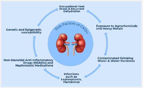 Despite increasing research interest, the etiology and pathogenesis of CKDu remain poorly understood. A wide range of potential risk factors has been proposed, including chronic heat stress, recurrent dehydration, exposure to agrochemicals and heavy metals, infectious agents, genetic predisposition, and socioeconomic determinants such as poverty, poor nutrition, and inadequate occupational protections [5]. However, the absence of a universally accepted case definition, coupled with methodological variability across studies, has hindered the development of consensus on causation, diagnosis, and management.