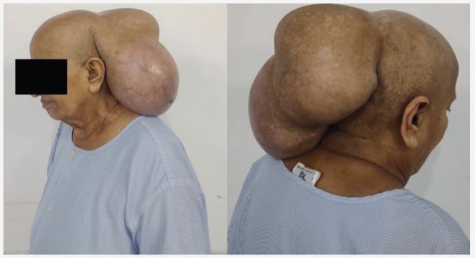 An elderly woman, aged 72, was admitted to the neurosurgical ward with a complaint of a large swelling on her scalp that had been present for 50 years. She first noticed the swelling when she was 22 years old, and it was initially about 5×5 cm in size. However, it kept growing slowly, and over the last five years, it started increasing more rapidly towards the left side. The swelling also became ulcerated at the apex. The patient had also been experiencing neck pain for the last year, which radiated to her left shoulder, especially when standing. She also complained of a deformity in her neck that caused an abnormal forward bend. The swelling was so large that the patient was unable to sleep or lie down in a supine position. However, she had no associated complaints of fever, weight loss, or any other lumps in her body (Figure 1).