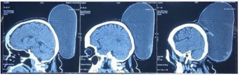 Thin walled, cystic fluid collection of size 26×24×12 cm seen arising from deep scalp layers of left parieto-occipital region, extending from midline posterior high parietal region up to posterior aspect of occipital bone abutting their outer cortices and with normal underlying bone with no intra-cranial extension of the lesion (Figure 2).