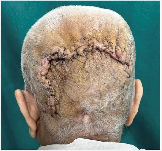 Complete en mass excision of the lesion was carried out by an elliptical incision under general anesthesia and the wound was closed in layers, after adjustment of the flaps. An elliptical incision with a vertical extension line was designed with consideration of redundant skin, and the dissection was extended from the subcutaneous layer to the subgaleal plane to expose the mass. Neovascularization was detected in the vicinity of the growth. Upon confirming that the mass was encapsulated, it was entirely removed. The mass had a weight of 3000 grams. Additionally, we excised the excess skin that had stretched to accommodate the mass and conducted primary closure. The wound healed without any problems or complications.