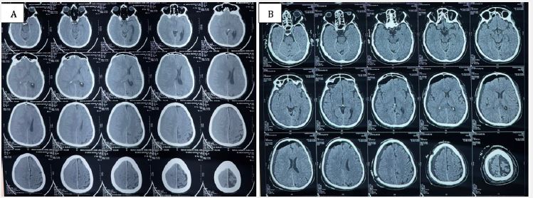 The procedure was uneventful, and the patient remained neurologically stable postoperatively with no new deficits. On April 22, 2025, follow-up NCCT showed partial resolution of the hematoma with no fresh bleed (Figure 2B). The patient was asymptomatic and neurologically intact.