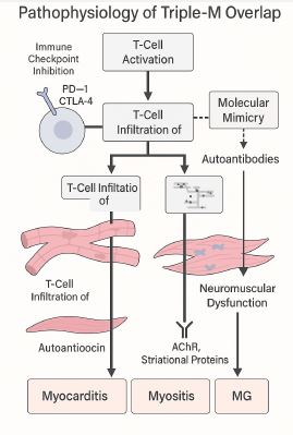 The pathogenesis of ICI-associated Triple-M overlap remains incompletely understood but is likely multifactorial, involving both cellular and humoral immune dysregulation.