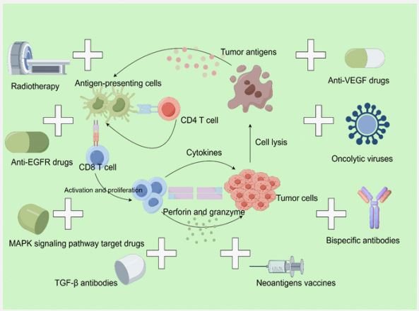 Immunotherapy in combination with oncolytic viruses: Oncolytic viruses (OVs) are multifaceted tumor killers that are novel strategies for oncology treatment. They can not only directly kill tumor cells while retaining normal cells, but also release antigens and cause inflammatory responses in tumor microenvironment that indirectly enhance the antitumor immunity [94]. Currently, a variety of viruses have been studied as a carrier for oncolytic viruses and there are undergoing clinical trials in the treatment of cancers, which are more common in melanoma and gastrointestinal tumors. These viruses include vaccinia virus, adenovirus, coxsackievirus, reovirus, measles virus, and herpes simplex virus [95]. What’s exciting is that studies have found that OVs and ICIs can work in tandem [96]. According to the research, OVs can turn the “cold tumor” to the “hot tumor” by killing tumor cells and also moving immune cells (like T cells, NK cells) to the tumor microenvironment, which can increase the sensitivity of tumor cells to ICIs. Additionally, by increasing the expression of the immune checkpoints on the tumor cells, OVs can improve the targeted function of PD-1/ PD-L1 inhibitors [97]. Studies have demonstrated that the triple therapy (OVs, CSF-1R, and anti-PD-1 antibodies) can increase T cell infiltration in tumors and enhance anti-tumor CD8+ T cell activity, which also reprogram the immunosuppressive tumor microenvironment to promote antitumor immunity. Ultimately, the tumor growth is controlled and survival is prolonged in mice with colon cancer [98]. With the union of low-dose mitomycin C and oncolytic HSV-1, which transfer the CD8+ and CD4+ T cells to the tumor cell, this also improved the sensitivity of ICIs in the mice model with dMMR CRC [99]. Therefore, considering that oncolytic virus can increase the sensitivity of tumors to ICIs, the combination of oncolytic virus and ICIs can be a effective treatment strategy for the patients with MSS CRC.