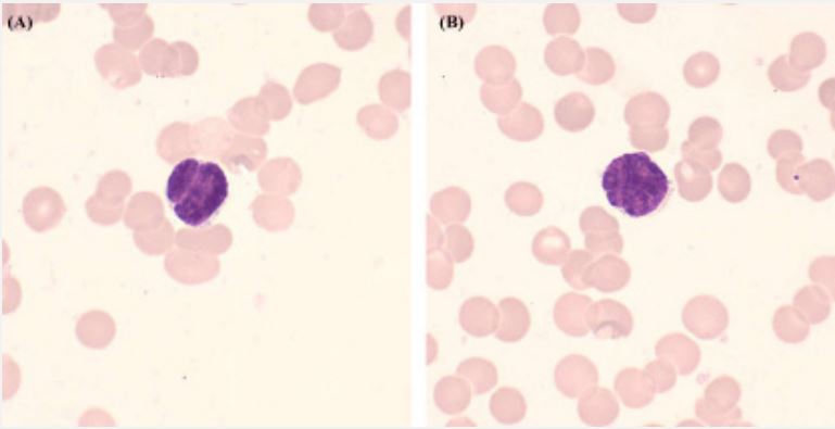 A 67-year-old male was admitted to the hospital due to fatigue and thrombocytopenia. Peripheral blood cells analysis showed the white blood cells count of 2.99 × 109 /L, red blood cell (RBC) count of 2.08 × 1012/L, platelet count of 15 × 109 /L. β2- microglobulin of serum was 5.50 mg/L. Whole-body positron emission tomography-computed tomography suggested altered reactivity in the lymph nodes of the bilateral neck. Morphological examination of bone marrow (BM) indicated the presence of abnormal smaller lymphocytes, accounting for 12.5% of the total nucleated cells. Strikingly, nuclear fission or brain gyrus nuclei were prominently observed in all abnormal lymphocytes (Figure 1, original magnification 1000×; Wright–Giemsa stain). The proportion of plasma cells was 0.5%, and no morphological abnormalities were observed. Additionally, some RBCs were exhibited a rouleaux arrangement. Flow cytometry analysis of BM identified 16.12% of κ-restricted B lymphocytes expressing CD5- , CD10- , CD19+ , CD20+ . A minimal proportion of 0.03% plasma cells with κ/λ ratio of 1.07. Consistent results were confirmed by immunohistochemistry in the BM biopsy. Immunofixation electrophoresis revealed abnormal monoclonal bands in the IgM and κ lanes. Furthermore, mutations of MYD88 (L265P), CXCR4 (T318fs), and TP53 (R306X) were identified through next-generation sequencing analysis. A diagnosis of lymphoplasmic cell lymphoma/waldenström macroglobulinemia (LPL/WM) was established.