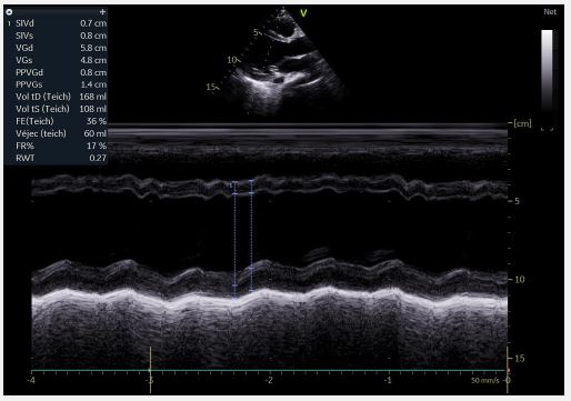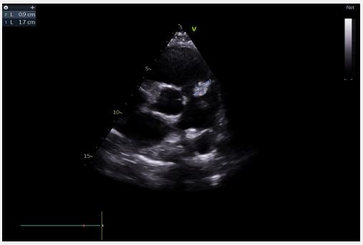Echocardiography revealed a restrictive PDA with a 6-mm diameter and a significant gradient, along with mobile vegetation attached to the pulmonary valve leaflets and the origin of the pulmonary artery (Figure 1), leading to severe pulmonary insufficiency. The mitral valve was calcified with a vegetation measuring 11×7 mm, and mild mitral regurgitation was noted. The Left Ventricle (LV) was dilated with reduced ejection fraction (Figure 2). The Right Ventricle (RV) was non-dilated with preserved systolic function. The Inferior Vena Cava (IVC) was slightly dilated but compliant. Extension investigations found no septic emboli.