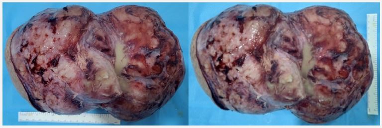 Complete en mass excision of the lesion was carried out by an elliptical incision under general anesthesia and the wound was closed in layers, after adjustment of the flaps. An elliptical incision with a vertical extension line was designed with consideration of redundant skin, and the dissection was extended from the subcutaneous layer to the subgaleal plane to expose the mass. Neovascularization was detected in the vicinity of the growth. Upon confirming that the mass was encapsulated, it was entirely removed. The mass had a weight of 3000 grams. Additionally, we excised the excess skin that had stretched to accommodate the mass and conducted primary closure. The wound healed without any problems or complications.