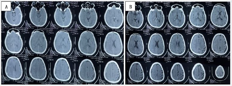 The procedure was uneventful, and the patient remained neurologically stable postoperatively with no new deficits. On April 22, 2025, follow-up NCCT showed partial resolution of the hematoma with no fresh bleed (Figure 2B). The patient was asymptomatic and neurologically intact.
