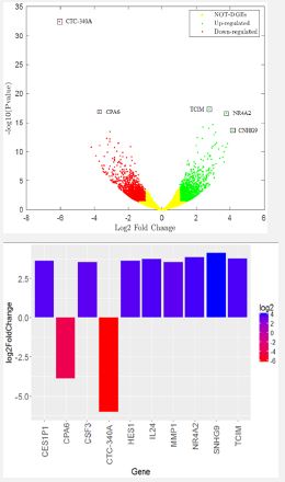 Also, another column chart was drawn to show 10 genes that had a different expression level than other genes among these 33 genes. So eight genes CES1P1, CSF3, HES1, IL24, MMP1, NR4A2, SNHG9 and TCIM have the highest expression level or in other words, the highest significant expression level and two genes CPA6 and CTC-340A have the lowest expression level or in other words, the lowest significant expression level have shown that in this study these 10 genes were reported as index genes with significant differences in expression (Figure 3b).